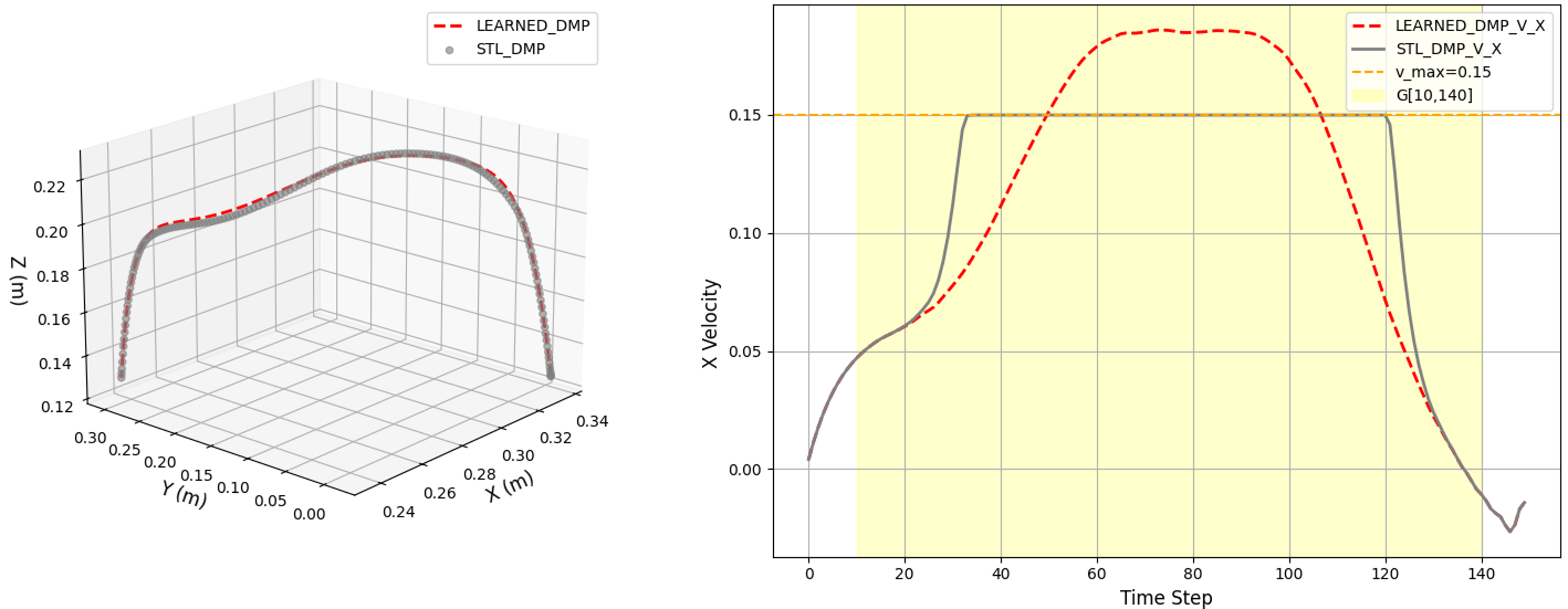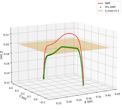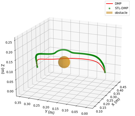 Moreover, we employed more simulation studies to validate the effectiveness of the proposed methods in generalizing DMP-based manipulation skills under various spatio-temporal constraints. Here we show via-point, obstacle avoidance, space‐limit, and velocity‐limit scenarios performances for STL-DMP generalization.