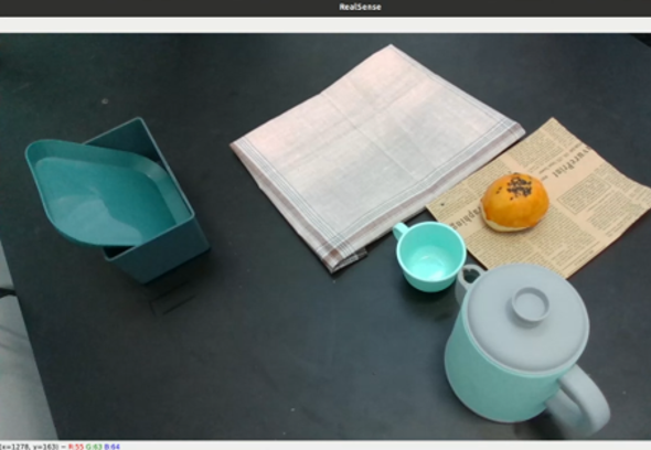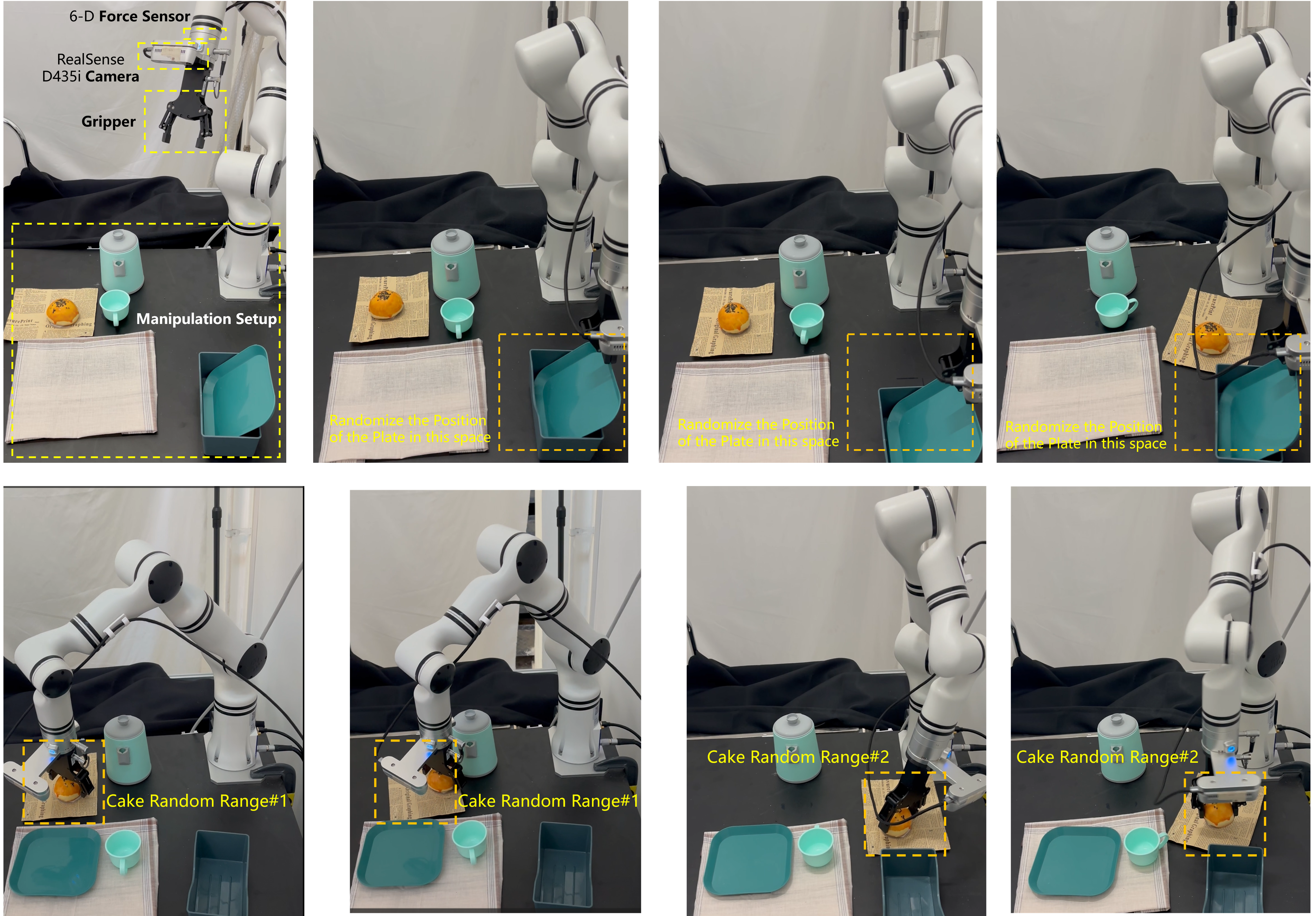 Here we show the basic set up with random objects positions in the whole real-world experiments process, which aims to execute manipulations, including different pick-and-place, pull out napkin and pour water actions.