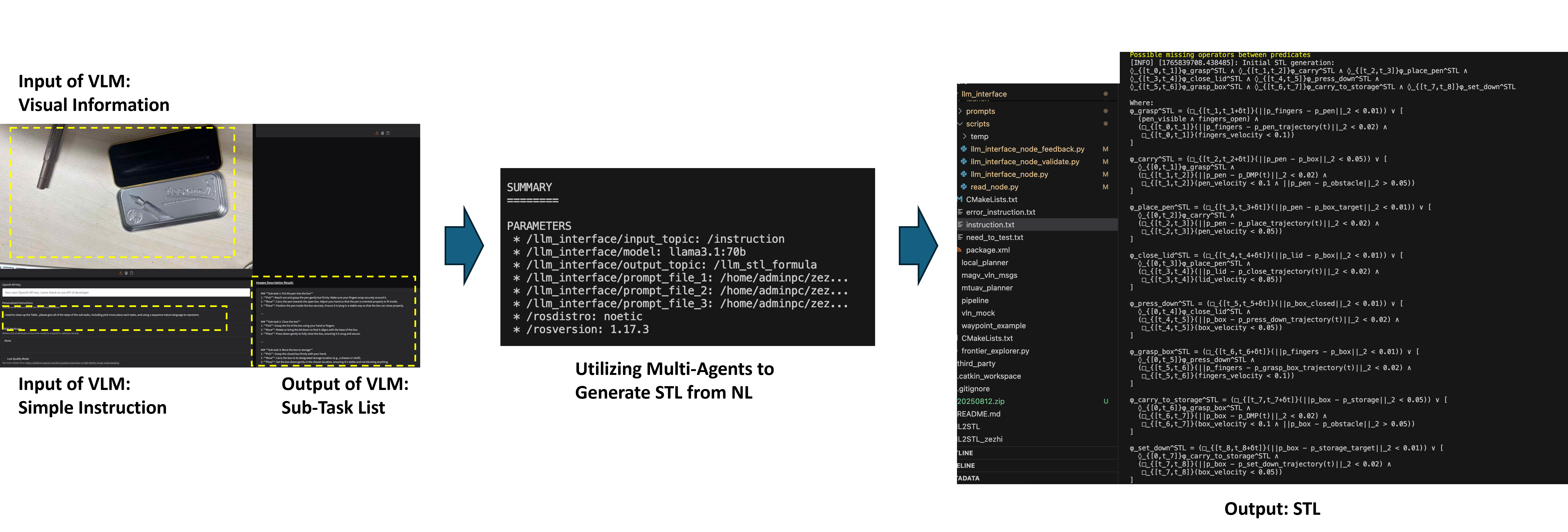 Within this framework, Signal Temporal Logic (STL) is employed to formally specify complex, long-horizon task requirements and constraints.